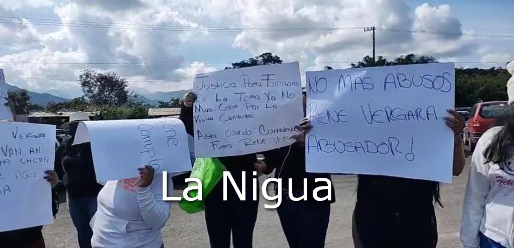 Los manifestantes portan cartulinas con las insignias “Justicia para familiares de la Toma”, “Ya no más cobros por la visita conyugal”, “Hasta cuando Cuitláhuac”, “Fuera René Vergara”, “No más abusos de René Vergara, Abusador” y “Cuitláhuac hasta cuando vas a permitir que René Vergara nos siga robando”.