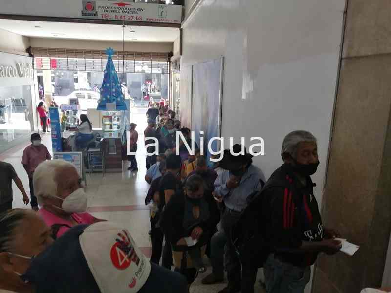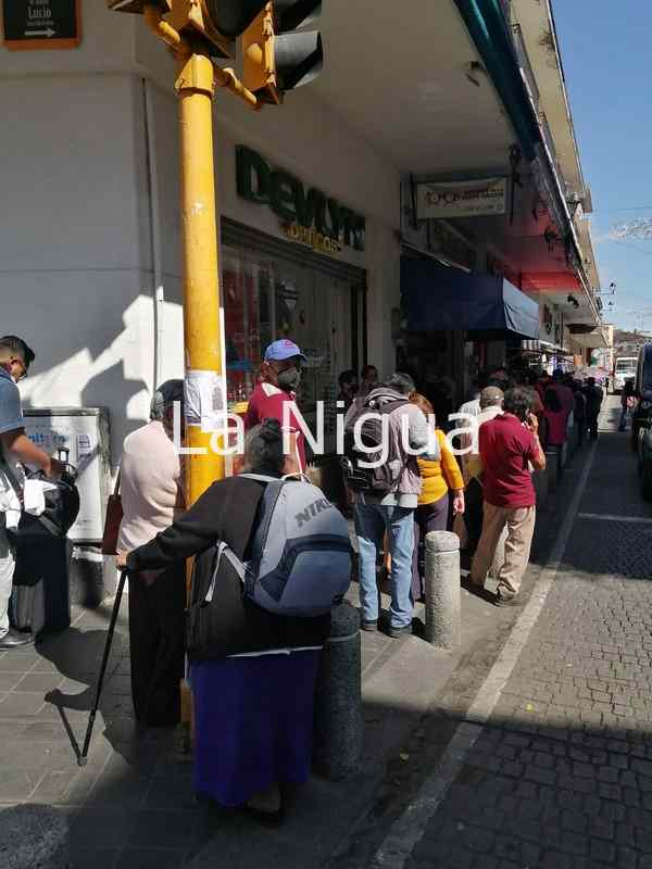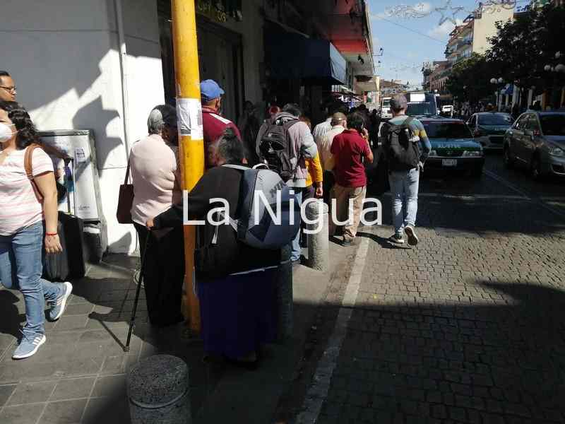 Xalapa, Ver.- Largas filas de gente de adultos mayores del programa de 65 años y más, ya que este día de jueves están cobrando lo de la tarjeta de adulto mayor por una cantidad de 3 mil 100 pesos por adulto, es el apoyo que otorga el Gobierno Federal, por lo tanto se observan largas filas desde el interior de pasaje tanos casi en la esquina con doctor Lucio, Ya que en el interior de este pasaje se encuentra el banco bienestar.