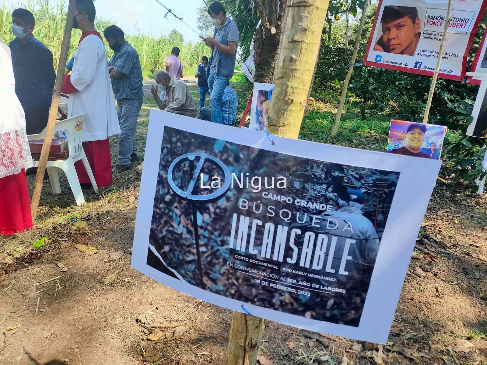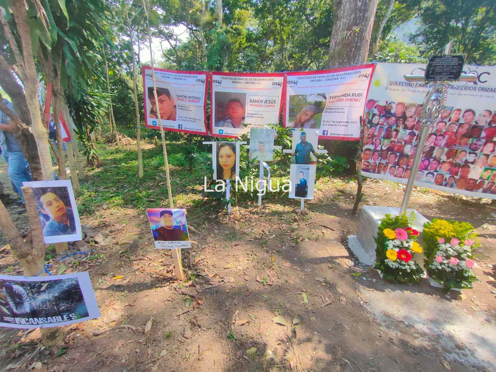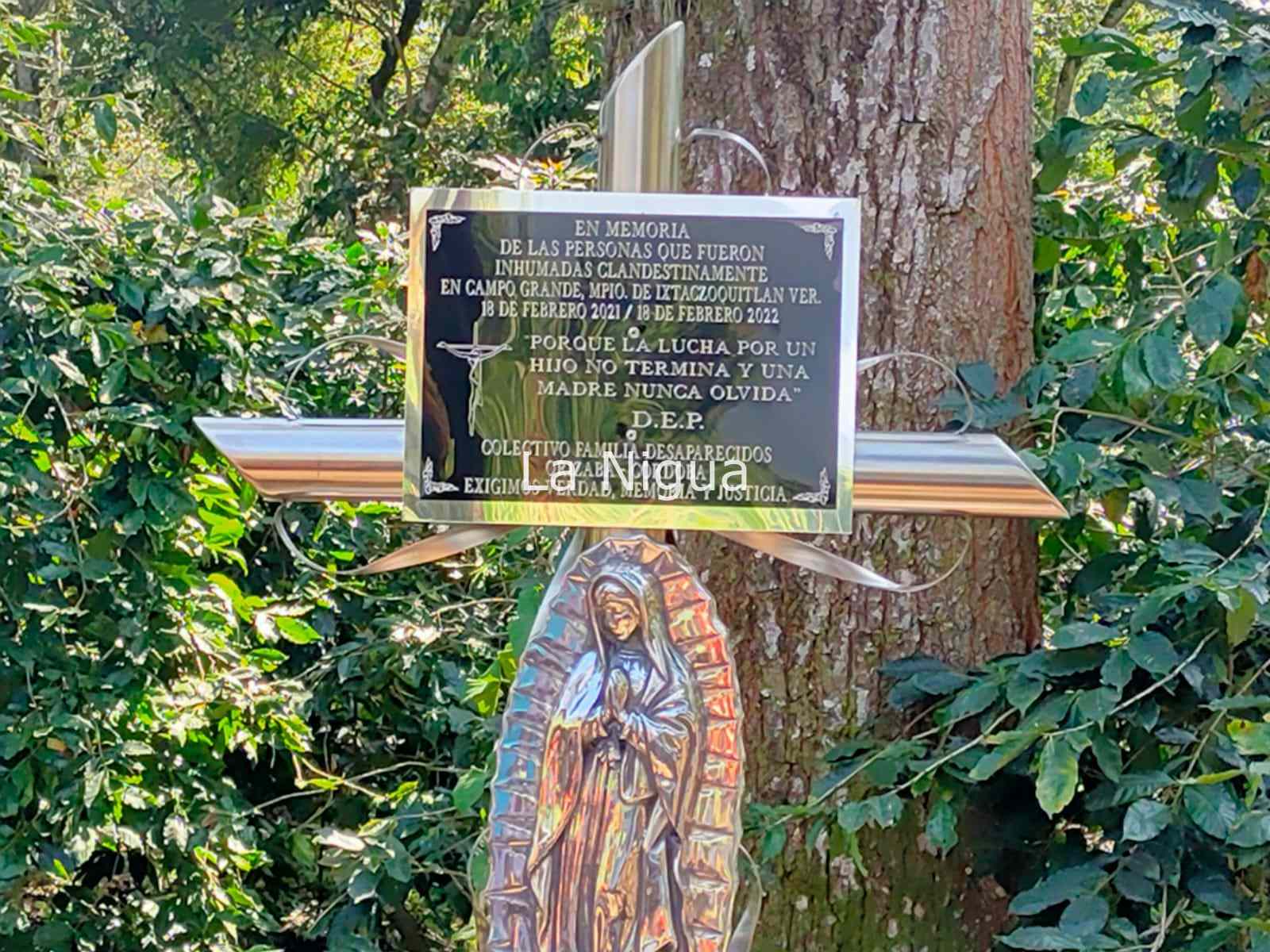 En el predio uno de los cinco y donde se localizaron los primeros restos humanos, los activistas colocaron una cruz de aluminio con una placa con el siguiente texto: “En memoria de las personas que fueron inhumadas clandestinamente en Campo Grande, municipio de Ixtaczoquitlán, Veracruz 18 de febrero de 2021-18 de febrero 2022. Porque la lucha por un hijo, no termina y una madre nunca olvida. Descansen en paz. Colectivo Familia Desaparecidos Orizaba-Córdoba. Exigimos, verdad, memoria y Justicia”.