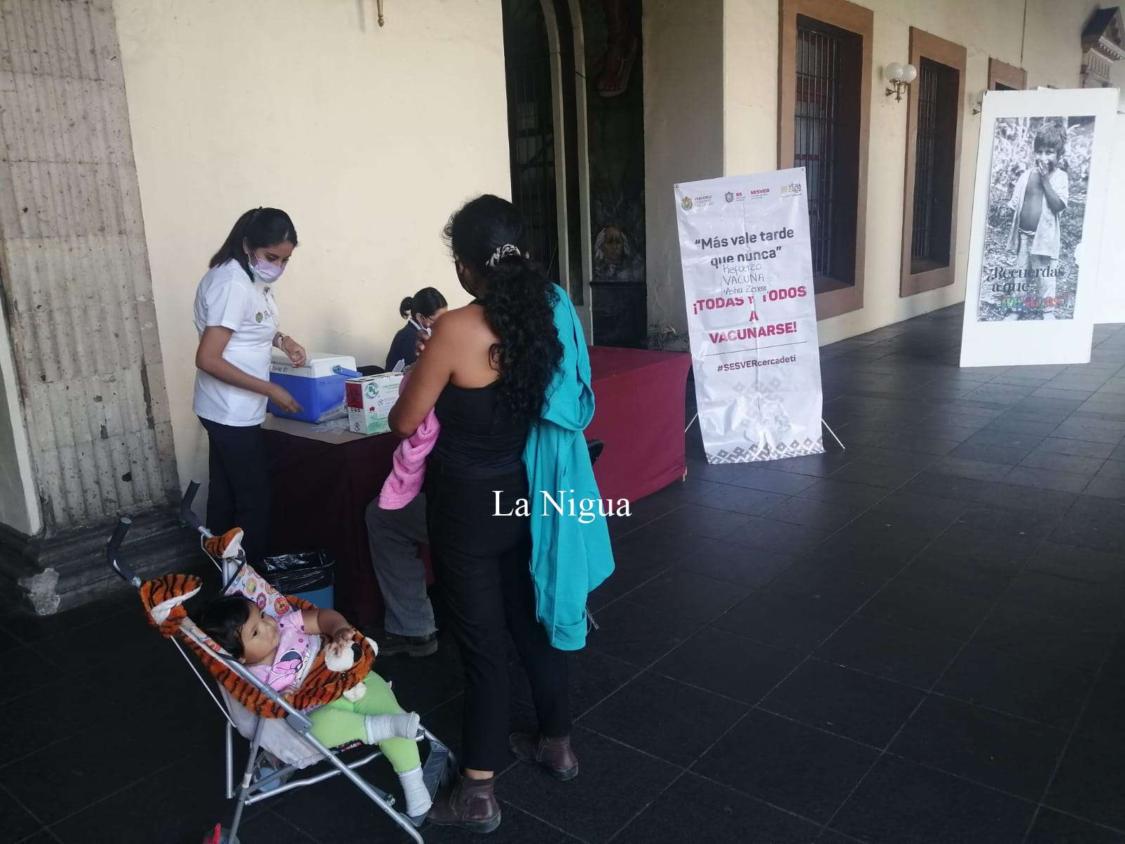 Xalapa, Ver.- En diferentes partes de la zona centro de esta ciudad de Xalapa, Personal de los Servicios de Salud del Estado de Veracruz (SS) así como de los Institutos Mexicano del Seguro Social (IMSS) y de Seguridad y Servicios Sociales para los Trabajadores del Estado (ISSSTE), instalaron puestos de vacunación y recorren los diferentes establecimientos comerciales de esta capital para aplicar aquellos ciudadanos la vacuna contra lo de la pandemia del Coronavirus Covid-19, ya que a aquellos trabajadores que aún no cuentan las dosis respectivas.