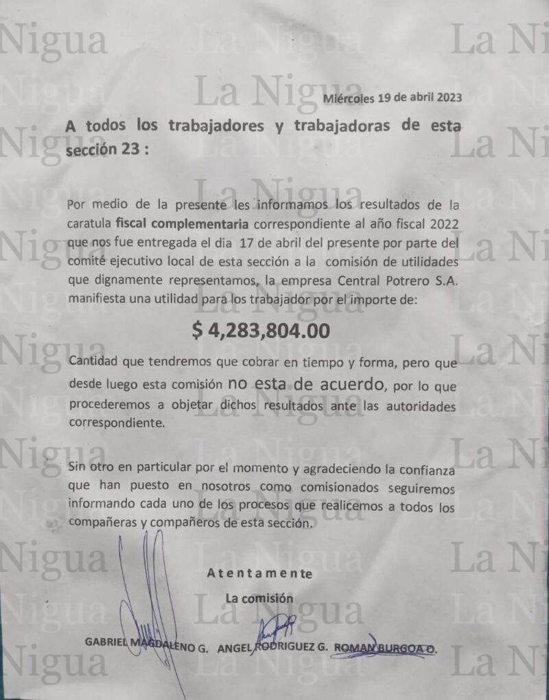 Atoyac,Ver.- El ingenio azucarero El Potrero, perteneciente al Grupo Beta San Miguel, envió a la Sección 23 de trabajadores azucareros la carátula fiscal 2022, donde les asigna un alcance de Utilidades por 4 millones 283 mil, 804 pesos.