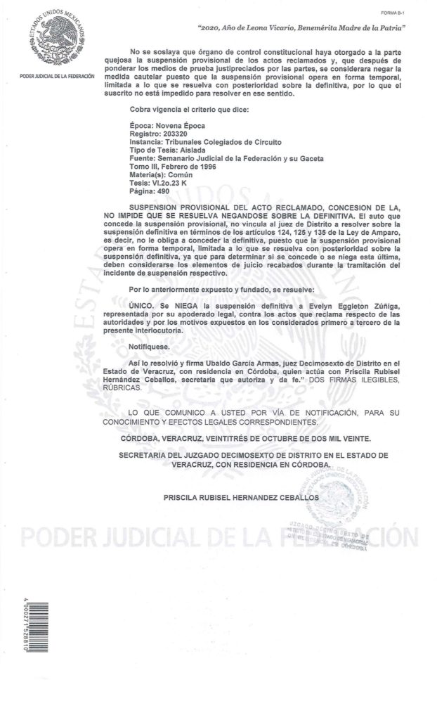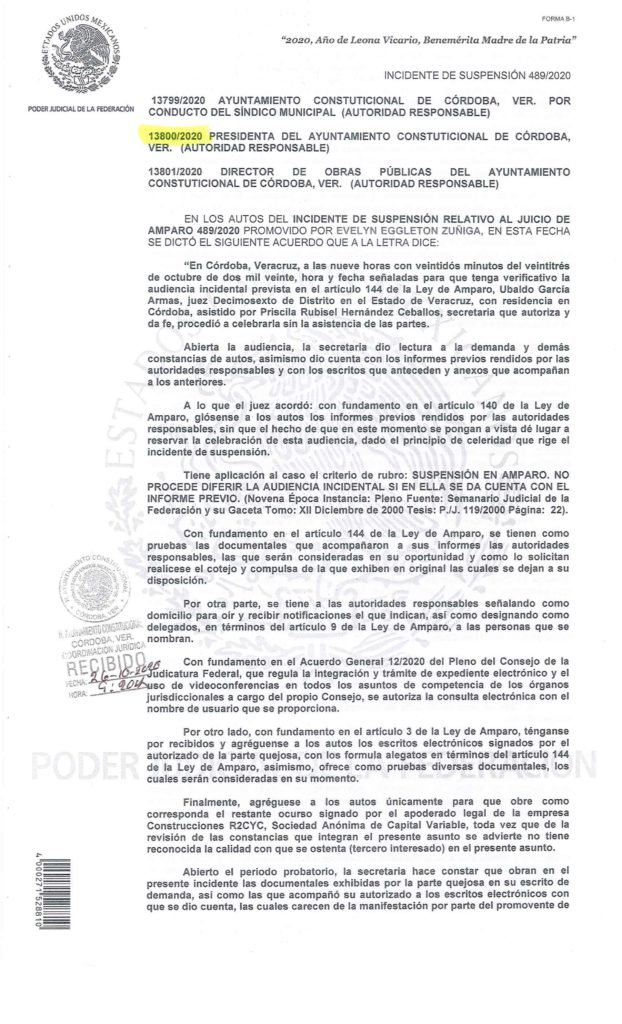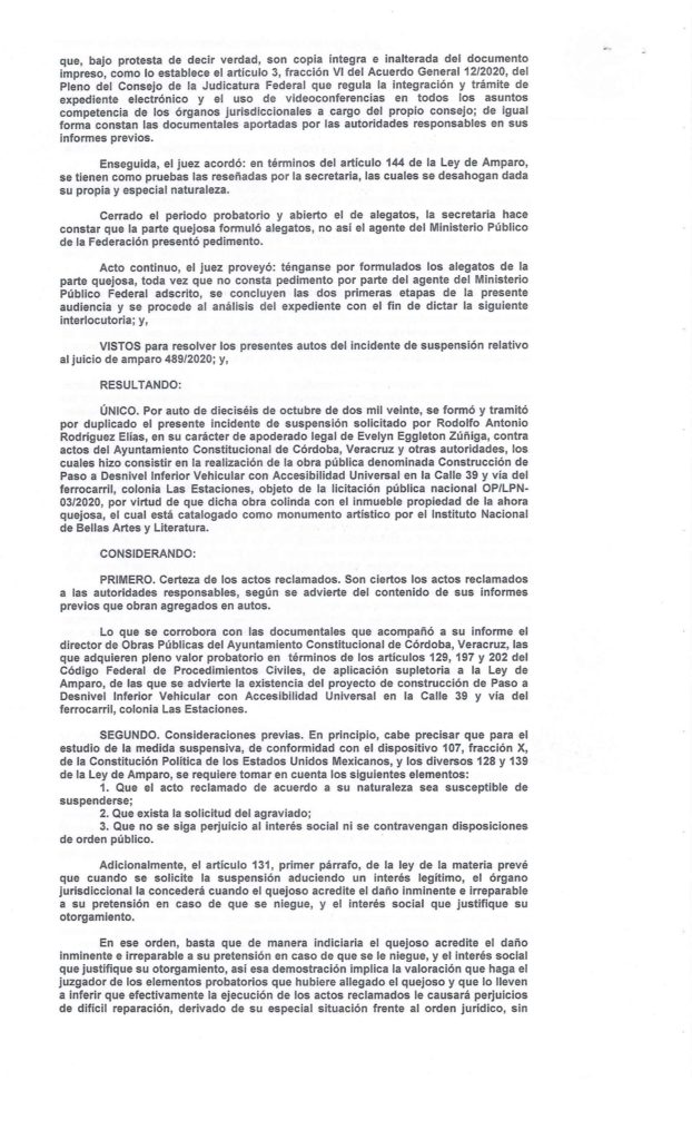 “El Ayuntamiento de Córdoba rindió un informe previo en el que otorgó diverso material probatorio que acreditó que, contrario a lo que sostuvo Evelyn Eggleton en el Juicio de Amparo, la citada obra y el inmueble conocido como El Buen Tono, no colinda, situación que el Juez de Distrito valoró”, dijo.