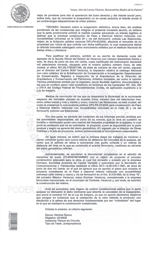 El Ayuntamiento de Córdoba continuará con la construcción del paso a desnivel en el barrio de Las Estaciones una vez que el Juzgado del Décimo Sexto Distrito, con sede en Córdoba, resolvió negar la suspensión definitiva al juicio de amparo promovido por Evelyn Eggleton Zúñiga, propietaria del inmueble conocido como El Buen Tono.