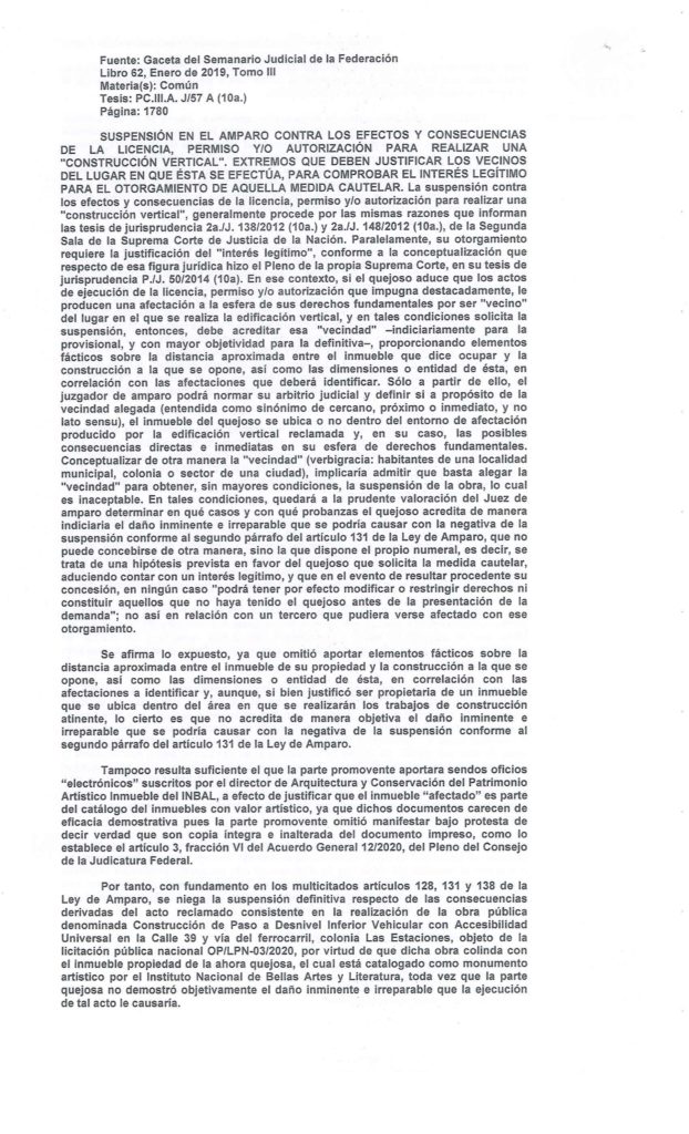 “Es falso que como consecuencia de que el edificio está en el catalogo del INBAL la ejecución de la obra no se puede realizar, si el edificio está o no está inscrito en el catálogo es algo que para el juicio de amparo no interesa”, señaló.
