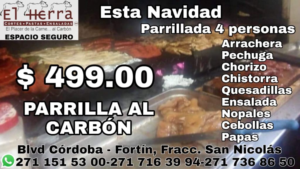 Compartir Facebook Twitter LinkedIn Pinterest Email Copy Link Súper Iberia: Tienda en línea Parrillada a tu casa $ 499.00 4 personas Arrachera Pechuga Chorizo Chistorra Quesadillas Ensalada Nopales Cebollas Papas Restaurante El Herra Whatsapp.- 271 151 53 00 Tel.- 271 716 39 94 y 271 736 86 50 Blvd Córdoba – Fortín, Fracc. San Nicolás
