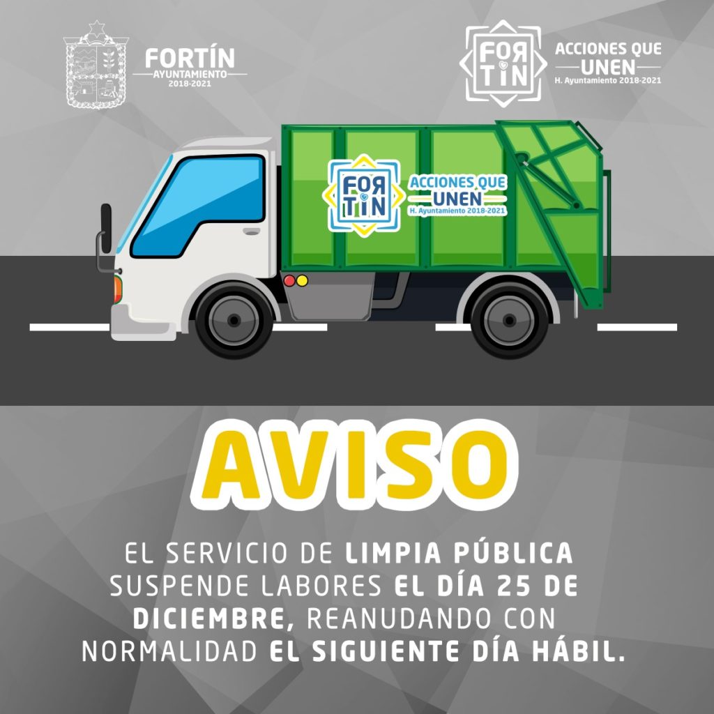 Fortín Ver., a 23 de diciembre de 2020.- Como parte de los festejos por la temporada decembrina y dando cumplimiento a la Ley Federal del Trabajo; se suspenderán labores en todas las áreas del Ayuntamiento de Fortín los días 25 de diciembre y 1ro de enero, incluyendo el servicio de recolección de basura efectuado por la Coordinación de Limpia Pública Municipal.