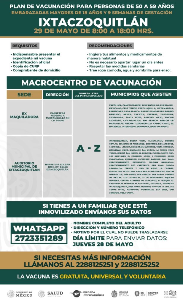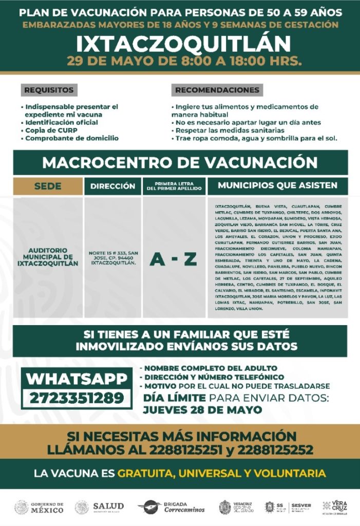 Ixtaczoquitlán, Ver.- El sábado 29 de mayo se estará aplicando la vacuna contra el Covid-19 para adultos entre 50 a 59 años y para mujeres mayores de 18 años con 9 semanas de gestación.