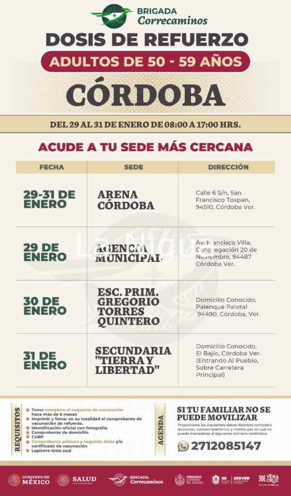 con la finalidad de acercar más el servicio a la población, la jornada de vacunación que se realizará del 29 al 31 de enero del 2022 en horario de las 08:00 a las 17:00 horas, en el municipio de Córdoba, Ver., Tendrá las siguientes sedes:
