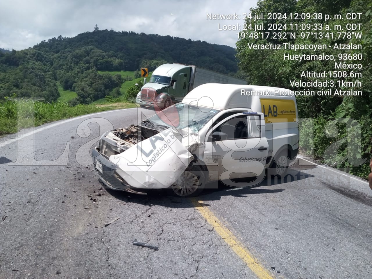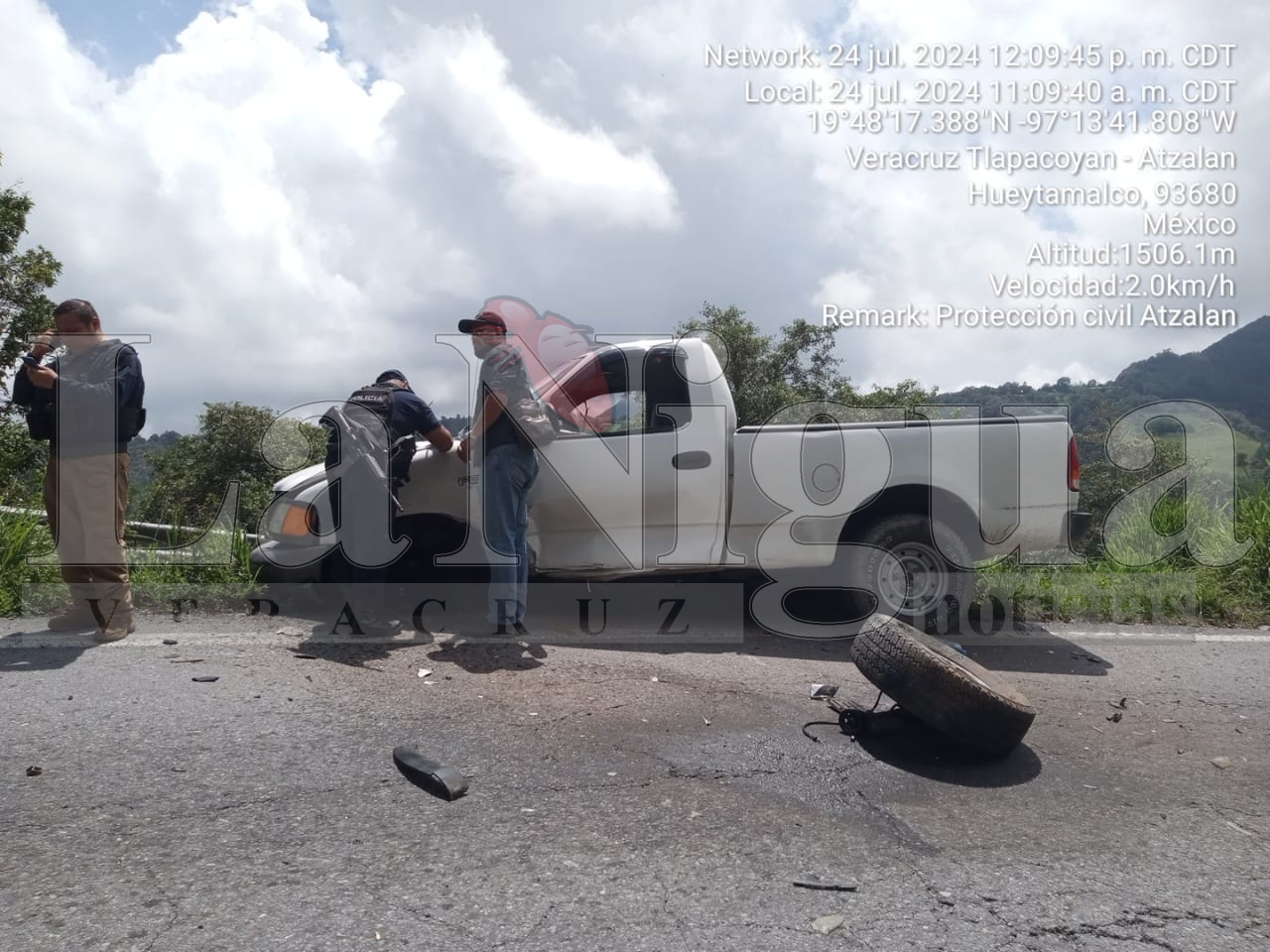 Atzalan, Ver.- Este miércoles, se registró un accidente en la carretera Atzalan-Tlapacoyan, a la altura del kilómetro 4+200, en el punto conocido como la curva del ADO. El incidente involucró un choque entre dos camionetas, resultando en daños materiales y una persona valorada en el lugar.