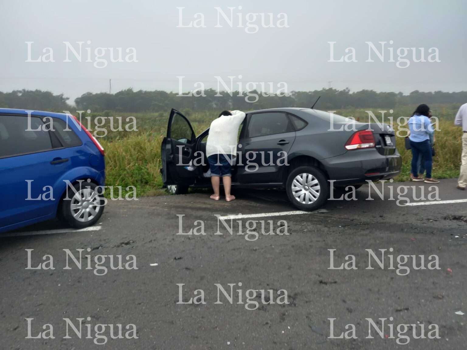 Más adelante tres unidades particulares chocaron, fueron un auto Volkswagen, tipo Gol, color Blanco, con placas YGD-404-B de Veracruz, que terminó en el pantano, su conductora salió ilesa.