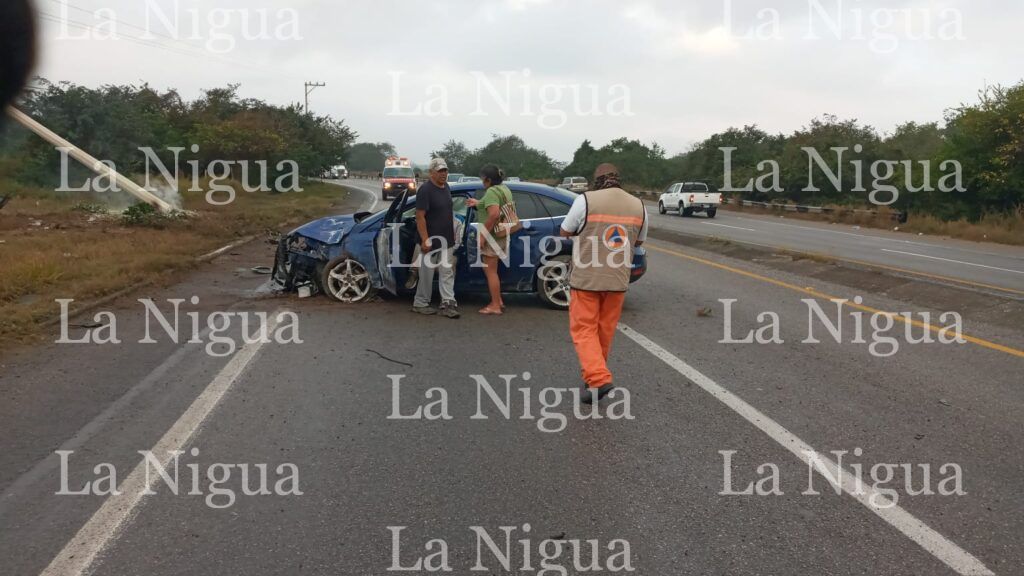 Altamira.-Personal de Protección Civil Regional con base en Altamira, reporta esta mañana de sábado que el conductor de un automóvil color azul que circulaba a exceso de velocidad, perdió el control del volante y se estrelló contra un poste, quedando destrozada la unidad.