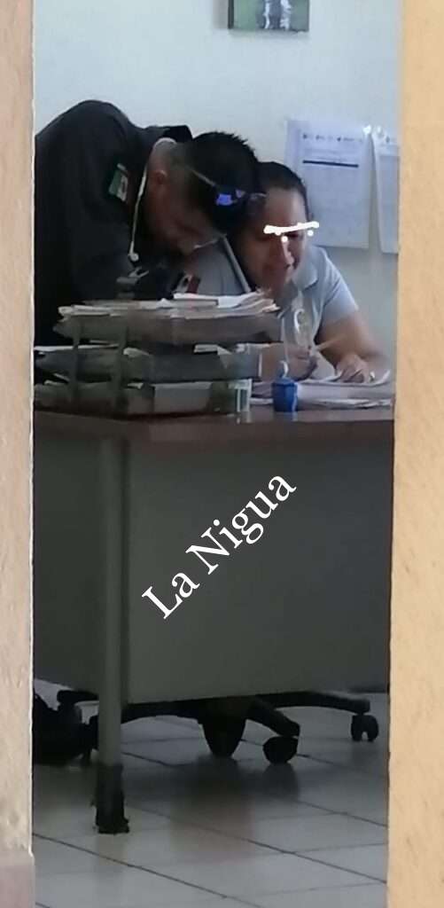 La enlace administrativo BLANCA una persona prepotente que aparte de que el salario es bajo se encarga de realizar descuentos sin que los elementos sepan el por qué le realizan los dichos descuentos y al preguntar ella se molesta y te grita y responde mal, aparte teniendo una relación amorosa con Arturo Cruz encerradose por horas en la oficina según a checar el trabajo