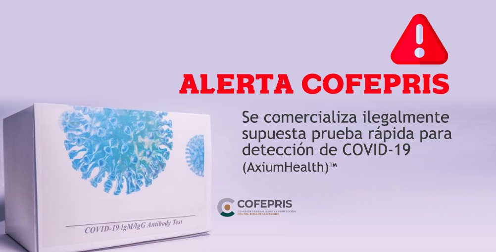 La Cofepris alerta sobre la venta del producto fabricado por Axium BioResearch, Inc., el cual es promocionado como prueba serológica para determinar IgG (inmunoglobulina G) e IgM (inmunoglobulina M) para COVID-19; y no cuenta con autorización para ser comercializada en territorio nacional.