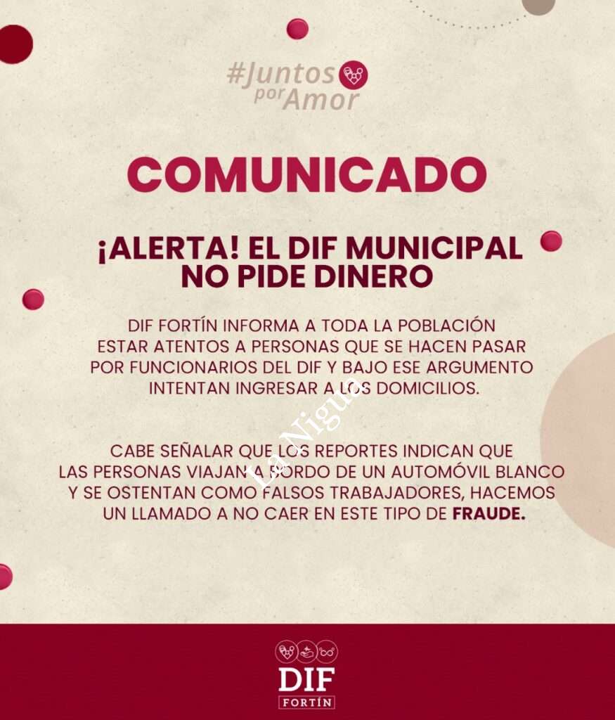 24 de enero de 2023, Fortín, Ver. – El Sistema para el Desarrollo Integral de la Familia DIF Fortín, hace un llamado a toda la población de mantenerse alerta por falsos funcionarios que se hacen pasar por empleados municipales y a cambio piden a la población dinero y datos personales para supuestos beneficios, la directora de dicha institución reiteró que en DIF no se pide dinero y eviten caer en este tipo de fraude.