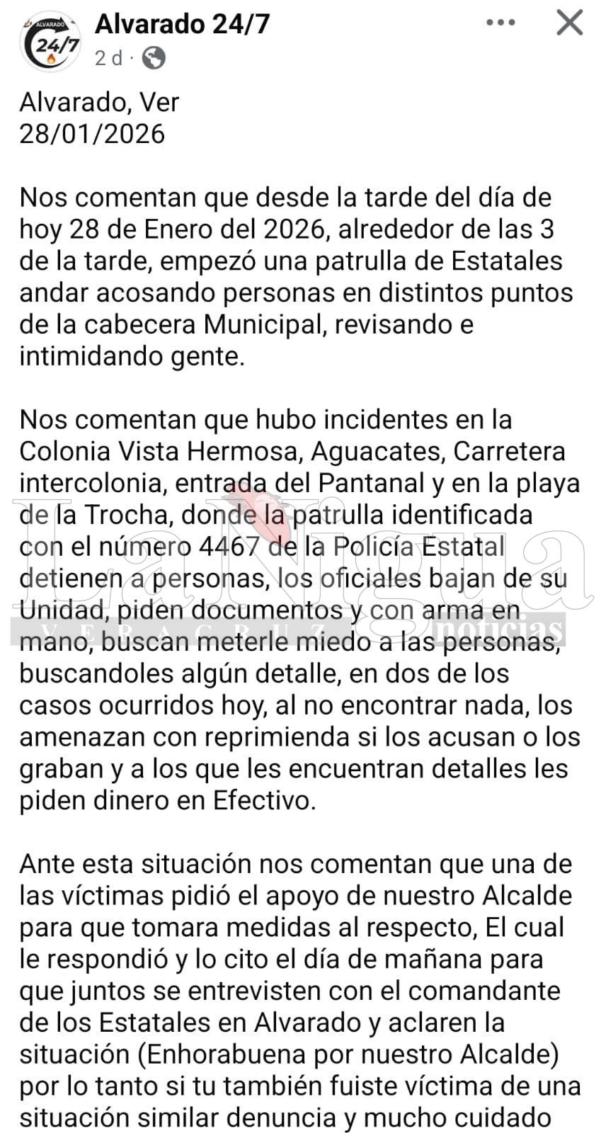 Alvarado, Ver.- A través de redes sociales, ciudadanos de Alvarado han denunciado el presunto acoso y abuso de autoridad de la Policía Estatal.