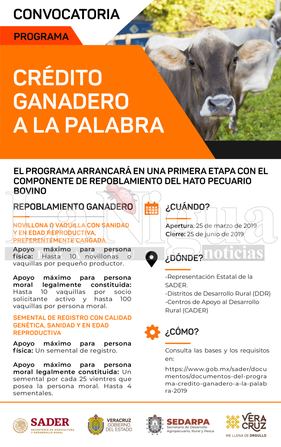Xalapa, Ver., 25 de marzo de 2019.- La Secretaría de Desarrollo Agropecuario, Rural y Pesca (SEDARPA) informó sobre la apertura de las ventanillas del Programa Crédito Ganadero a la Palabra en el componente Repoblamiento del Hato Pecuario Bovino, las cuales permanecerán abiertas del 25 de marzo al 25 de junio del año en curso.
