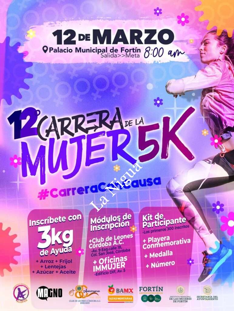 Fortín, Ver. – El próximo 12 de marzo se llevará a cabo la Carrera de la Mujer con causa y serán cinco kilómetros los que corresponden a la ruta sobre el bulevar Córdoba-Fortín, el H. Ayuntamiento de Fortín en coordinación con el Club de Leones de Córdoba A.C. realizaron la invitación a fin de colaborar con el Banco de Alimentos y apoyar a familias vulnerables de Fortín.