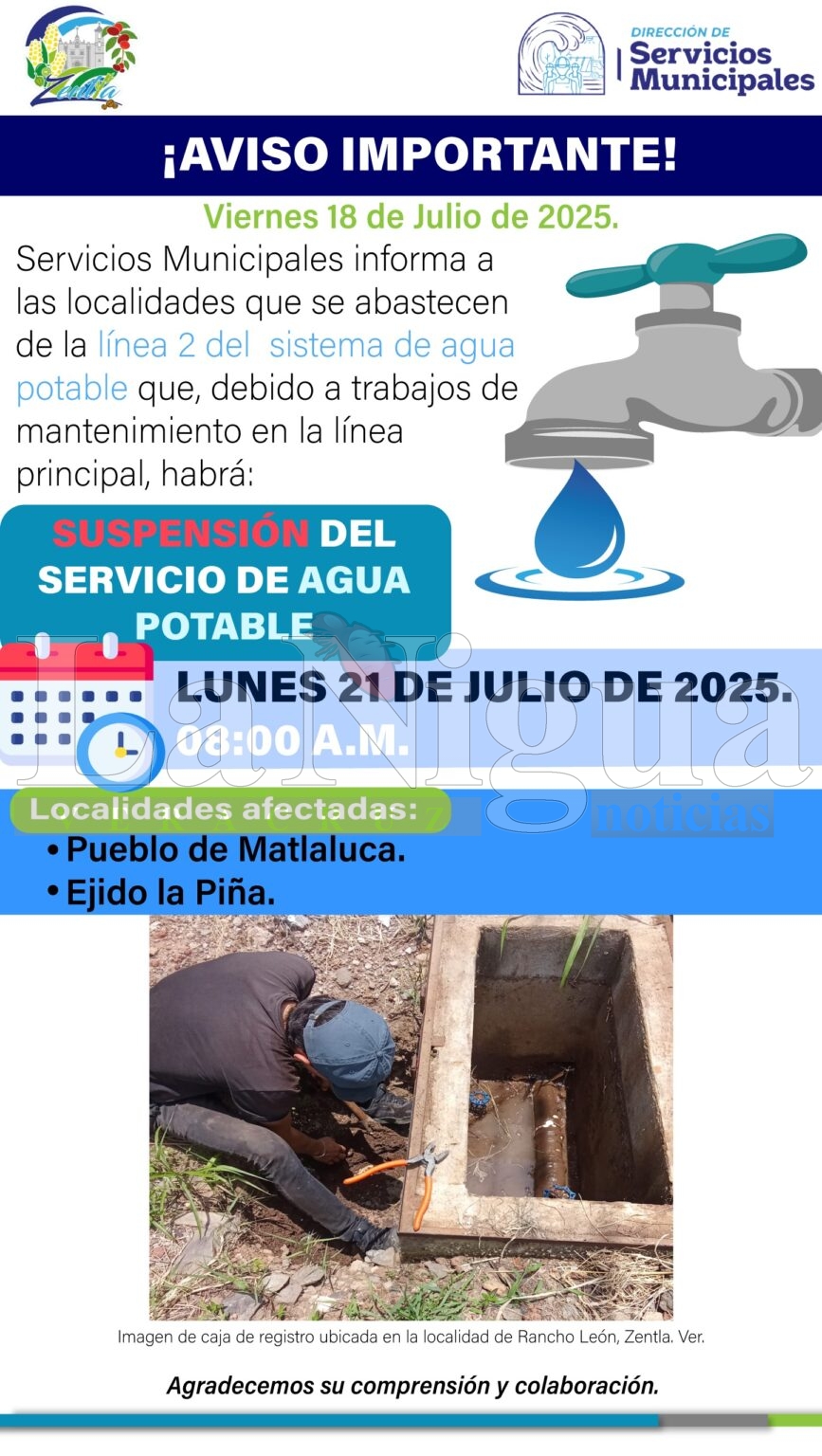 ZENTLA, VER. (Julio 18 de 2025) – La Dirección de Servicios Municipales informó que el próximo lunes 21 de julio, a partir de las 08:00 horas, se llevará a cabo una suspensión temporal del servicio de agua potable en varias localidades que dependen de la Línea 2 del sistema de abastecimiento, debido a trabajos de mantenimiento en la línea principal.