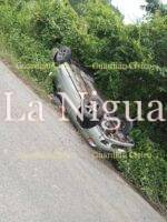 Indican que perdió el control de su vehículo Nissan, Tsuru, de color gris, y volcó de manera aparatosa; el hombre terminó aplastado por el vehículo a un costado de la cinta asfáltica.