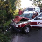 En este percance (lunes 22 de abril), se especula el chofer de una camioneta de Súper Pollo perdió el control de su unidad, provocando con esto que se saliera del camino un autobús de la línea Azules de Huatusco que iba en viaje especial e impactando de frente contra un taxi de Chocamán, marcado con el número de unidad 6.