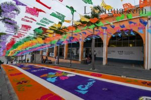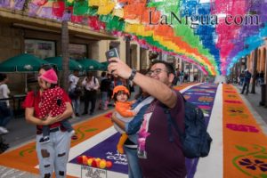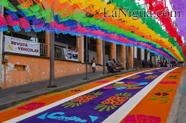 El tapete monumental de 60 metros de largo y cuatro metros de ancho, fue diseñado por artesanos de Huamantla encabezados por sabino Hernández y muestra en sus detalles la muerte, la vida y el color de la ciudad de los 30 Caballeros.