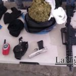 Fueron aseguradas, un arma larga marca Bushmaster sin número de serie, un arma larga AR-15, sin número de serie, un arma corta, marca Bryco, con número de serie 793724, 9mm, cromada, un cargador de arma corta, dos cargadores de arma larga, 42 cartuchos útiles calibre .223 mm, 5 cartuchos útiles de 9 mm, 5 cartuchos útiles de .45mm, así como 2 kilogramos aproximadamente de hierba verde con características similares a la mariguana, dos celulares y dos capuchas negras.