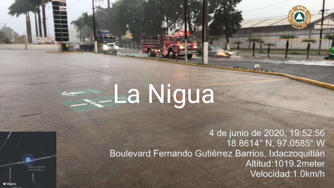 La fuerte lluvia provocó anegamientos en Avenida Oriente 3 entre Calle Norte 13 y 15 del Barrio San José, en Avenida Díaz Mirón esquina con Calle Norte 4, Calle Reforma y Avenida Reforma en Potrerillo Pueblo, y en Avenida San Juan a la altura de la Colonia Lezama por rebosamiento de laguna La Joya.