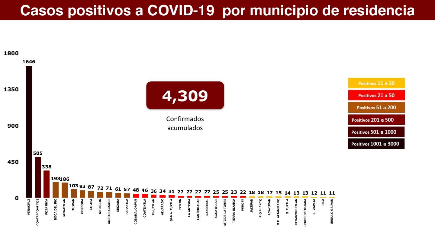 La cifra de positivos acumulados es de 4 mil 309 en 140 demarcaciones y 729 activos: Veracruz 1646, Coatzacoalcos 505, Poza Rica 338, Boca del Río 193, Minatitlán 186, Tuxpan 103, Córdoba 93, Xalapa 87, Medellín 72, Cosoleacaque 71, Orizaba 61, Papantla 57, Cosamaloapan 48, Coatzintla 46, Tihuatlán 36, Alvarado 34, San Andrés Tuxtla 31; La Antigua, Las Choapas, Fortín y Nanchital 27; Agua Dulce y Martínez de la Torre 25; Tierra Blanca 23, Perote 22, Jáltipan y Río Blanco 18.