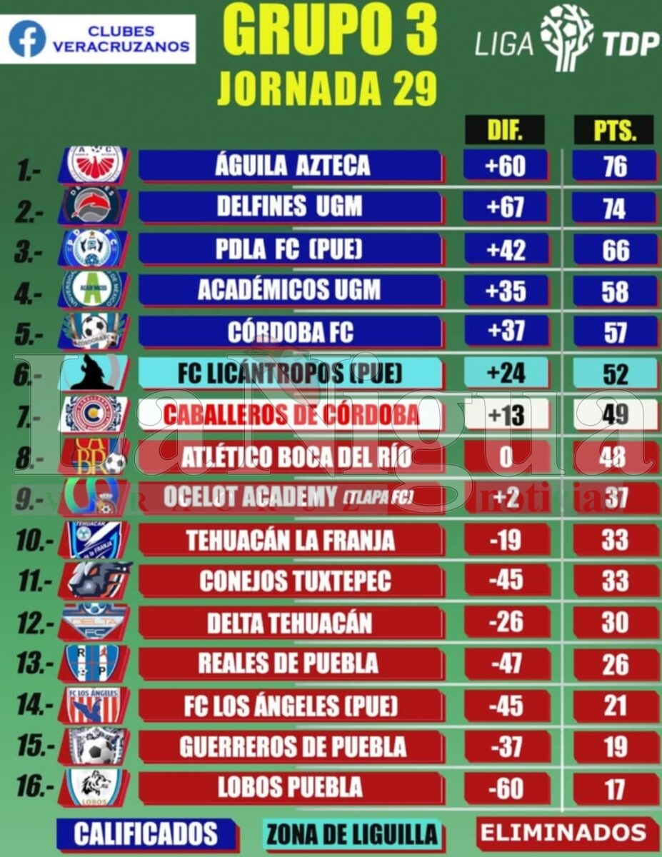 En la jornada 29 los dos equipos que pelean el sexto lugar perdieron y Licán-tropos mantiene los tres puntos de distancia sobre los Caballeros de Córdoba, faltando la fecha 30, matemáticamente se puede dar el empate en pun-tos, pero en diferencia de goles, los de Puebla son superiores y difícilmente los cordobeses puedan meter tantos goles, por lo que aun no, pero ya.