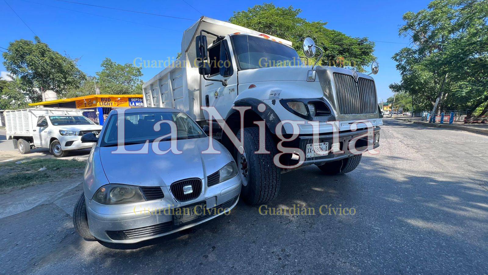 Por intentar ganarle el paso a un camión de volteo, un imprudente automovilista provocó un percance que dejó como saldo únicamente daños materiales mínimos.