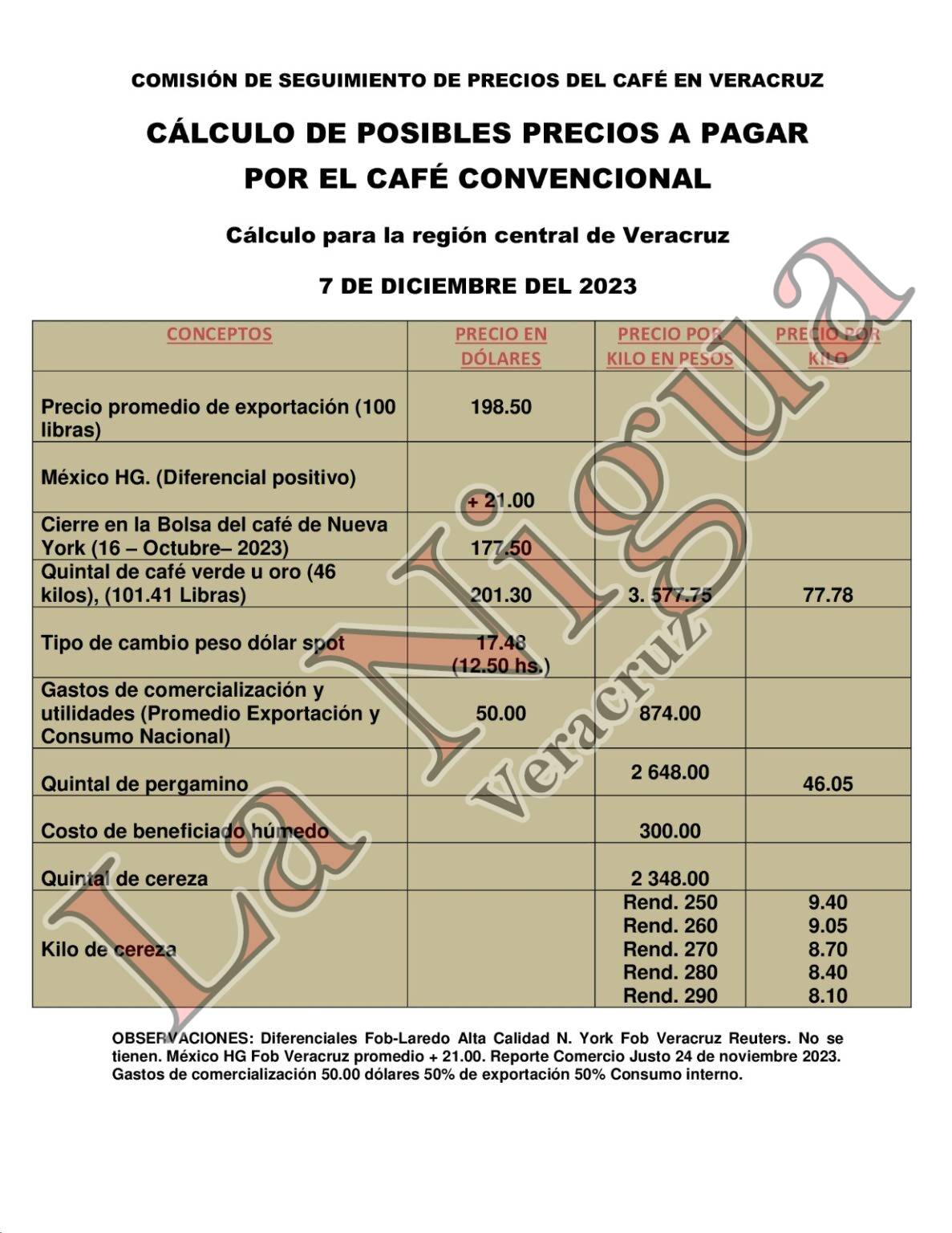 La disminución de la prima (sobreprecio o diferencial positivo) de los cafés Arábigos Lavados.La fuerte apreciación del peso mexicano ante el dólar (menos pesos por dólar)Y que las compañías compradoras, para no disminuir sus ganancias aumentan lo que aplican de gastos de comercialización en las compras a los productores.