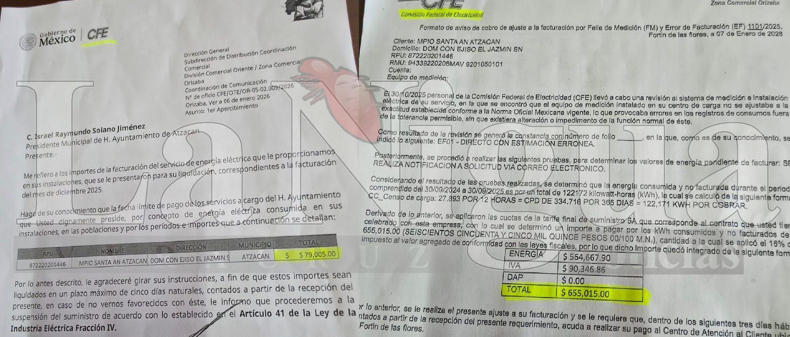 Atzacan, Ver. – La Comisión Federal de Electricidad (CFE) impuso una multa superior a los 600 mil pesos al ayuntamiento de Atzacan tras detectar consumo eléctrico no facturado en el sistema de alumbrado público, resultado del uso de dispositivos clandestinos conocidos como “diablitos” durante la administración pasada.