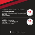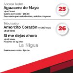 El 25 de marzo, a las 19 horas, la compañía Accesa Teatro estará presentándose con la obra “Aguacero de Mayo”, cuyo acceso será de 50 pesos; para el 26 la compañía Tributeatro montará las obras “Amorcito Corazón”, que es un monólogo, a las 18:30 horas, y posteriormente “Si me dejas ahora”, obra exclusiva para mayores de 15 años de edad.