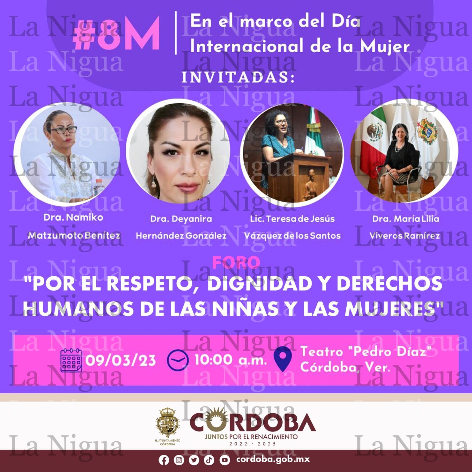 Córdoba, Ver., (8 de marzo del 2023). – En continuidad por el Día Internacional de la Mujer, este jueves 9 de marzo, el Ayuntamiento de Córdoba, brinda el Foro “Por el Respeto, Dignidad y Derechos Humanos de las Niñas y Mujeres”, integrado por cuatro ponencias relacionadas con la mujer, así lo dio a conocer, la Síndica Única, Vania López González.