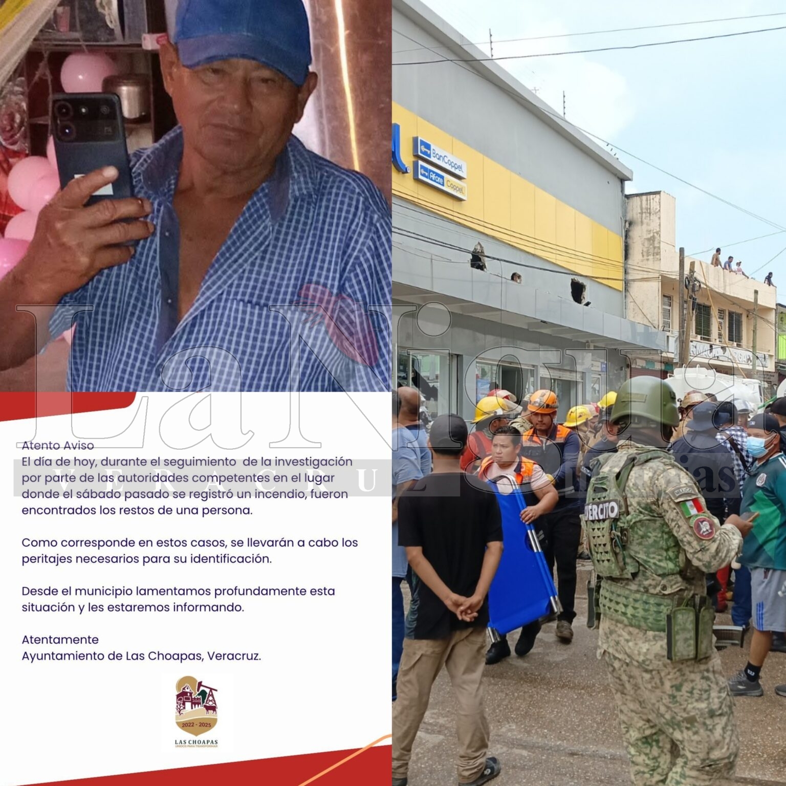 Las Choapas, Ver. – El Ayuntamiento de Las Choapas informó que, durante el seguimiento de las investigaciones realizadas este lunes en el lugar donde el pasado sábado se registró un incendio en la tienda departamental Coppel, fueron localizados los restos de una persona.