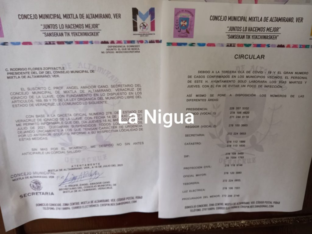 De acuerdo a una circular que se encuentra colocada a la entrada del Palacio Municipal, establece: “Debido a la tercera ola de Covid-19 y el gran numero de casos confirmados en los municipios vecinos, el personal de este Ayuntamiento solo laborara los días martes y jueves con el fin de evitar un foco de infección”.