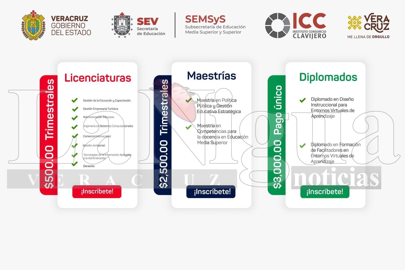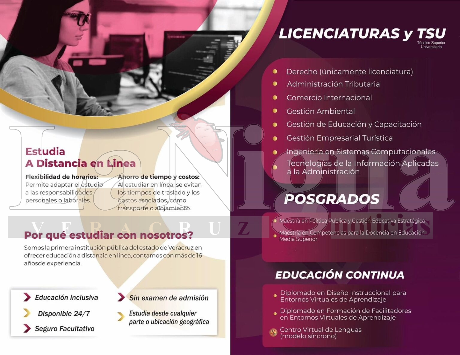 Entre las licenciaturas en línea disponibles, Ventura Ramírez mencionó opciones como Derecho, Ingeniería en Gestión Empresarial, Ingeniería en Sistemas Computacionales, Gestión en Educación y Capacitación, Administración Tributaria, Comercio Internacional, Tecnologías de la Información Aplicadas a la Administración, y Gestión Ambiental. Asimismo, las maestrías ofrecidas son Política Pública y Gestión Educativa Estratégica, y Competencias para la Docencia en Educación Media Superior.
