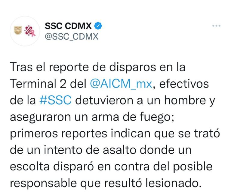 Al respecto de esta balacera en la Terminal 2 del AICM, Omar García Harfuch, Secretario de Seguridad Ciudadana de la Ciudad de México, tuiteó que las dos personas heridas se encuentran fuera de peligro y que uno de los responsables ya fue detenido, mismo que presenta lesión por arma de fuego.