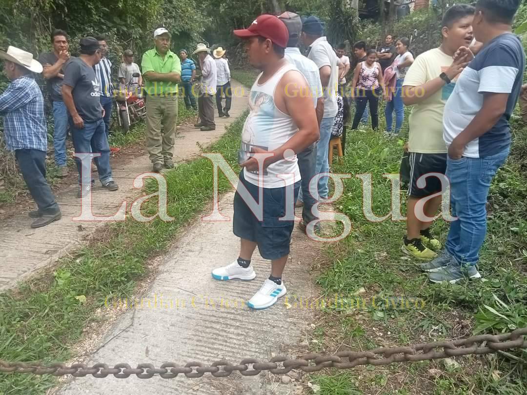 Con una cadena de acero, comuneros de la localidad de La Esperanza bloquearon la entrada para impedir que vehículos de empresas que suben a vender sus productos no ocupen el camino ya que no aportan nada para la rehabilitación de está vía que comunica a la parte serrana del municipio.