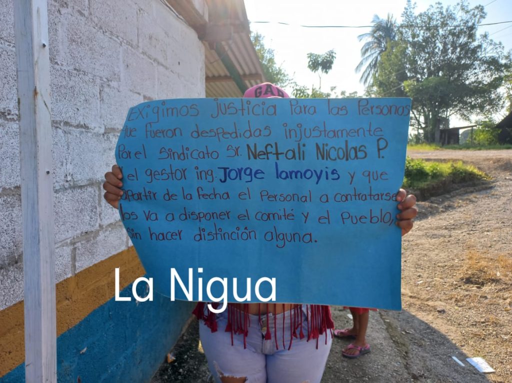 Explicaron que los excesos en que ha incurrido Nicolás Pacheco, tienen que ver con la explotación laboral hacia los trabajadores de la comunidad, despido injustificado de trabajadores no afines a sus intereses, así como amenazas de muerte a los integrantes del comité de gestión de la comunidad, por lo que exigimos la destitución inmediata del señor Neftalí Nicolás Pacheco, representante de la CATEM en este municipio de Uxpanapa, y solicitamos se instale una mesa de negociación con el secretario general de la Federación Autónoma de Trabajadores y Empleados del Estado de Veracruz (CATEM), Enrique Santos Mendoza, así como con él representan del Pozo “Yolox” de exploración de la Paraestatal Pemex, en este municipio, los manifestantes portan cartulinas en sus manos con varias consignas a su petición.