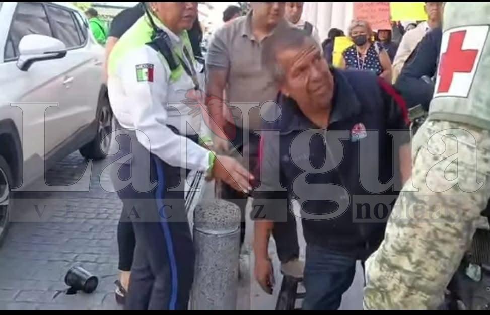 Xalapa, Ver., martes 16 de diciembre de 2025.— La mañana de este martes se registró un percance vial frente al Palacio de Gobierno, en la ciudad de Xalapa, donde un bolero de oficio fue impactado por una camioneta SUV compacta color blanco, de la marca JAC.