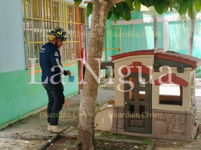 Atendiendo la solicitud de docentes y padres de familia del Jardín de Niños Benito Juárez García, el equipo de Bomberos Municipales acudieron para apoyar en el retiro de panales de avispas y enjambres.