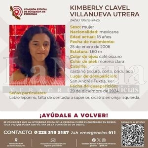 Finalmente una joven de nombre Kimberly Clavel Villanueva Utrera desaparecida el día 29 de diciembre del 2024, de 18 años de edad, estatura 1.60, color de ojos café obscuro, color de piel morena clara, cabello castaño obscuro, corto y ondulado y como señas particulares labio leporino, falta de dentadura superior, cicatriz en oreja izquierda.