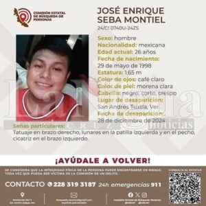 José Enrique Seba Montiel de 26 años de edad, estatura 1.65, ojos café claro, piel morena clara, cabello negro, corto y crespo y como señas particulares tatuaje en brazo derecho, lunares en la patilla izquierda y en el pecho, cicatriz en el brazo izquierdo.
