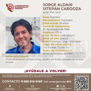 La Comisión Estatal de Búsqueda de Personas Desaparecidas ha emitido la alerta de cuatro personas desaparecidas en el municipio de San Andrés Tuxtla, hechos suscitados en diferentes fechas.