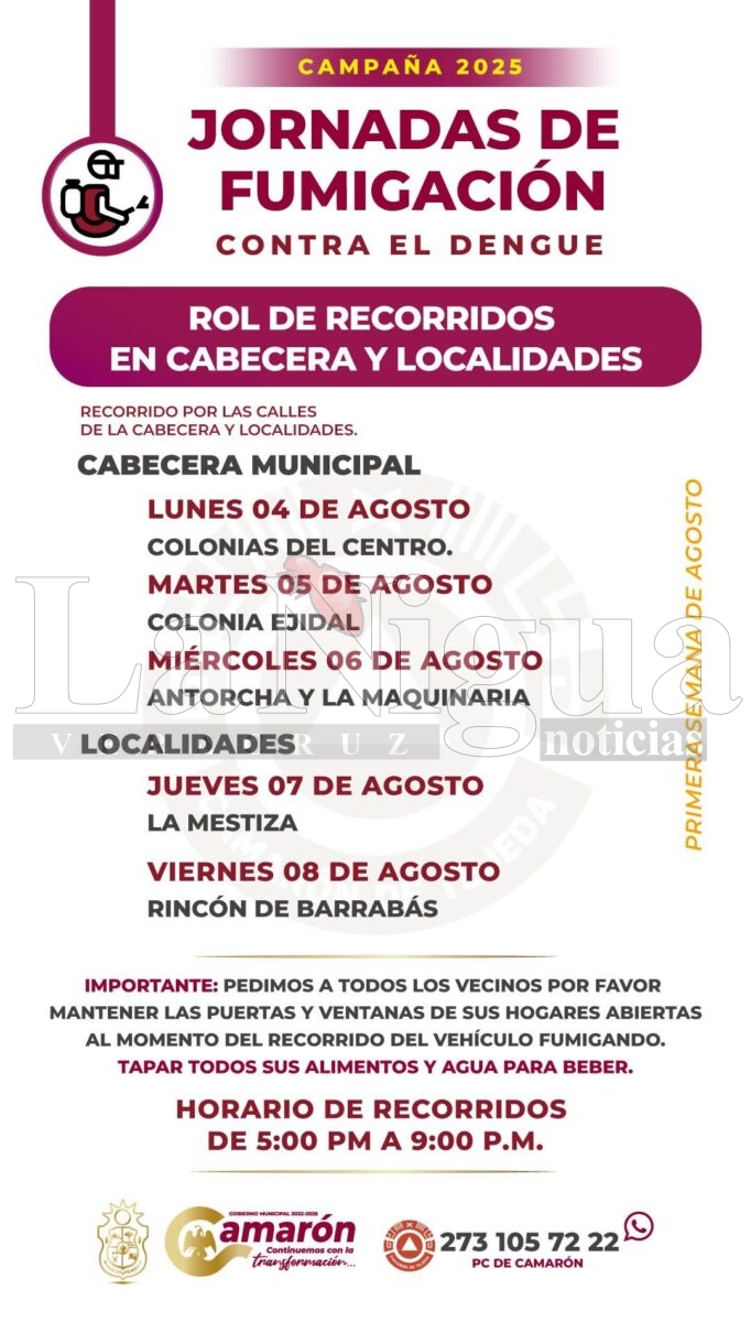 Las acciones iniciarán en las colonias del centro de Camarón de Tejeda, con fumigaciones programadas durante las tardes y noches a partir de las 5:00 p.m., mediante el uso de termonebulización como método de control de vectores.