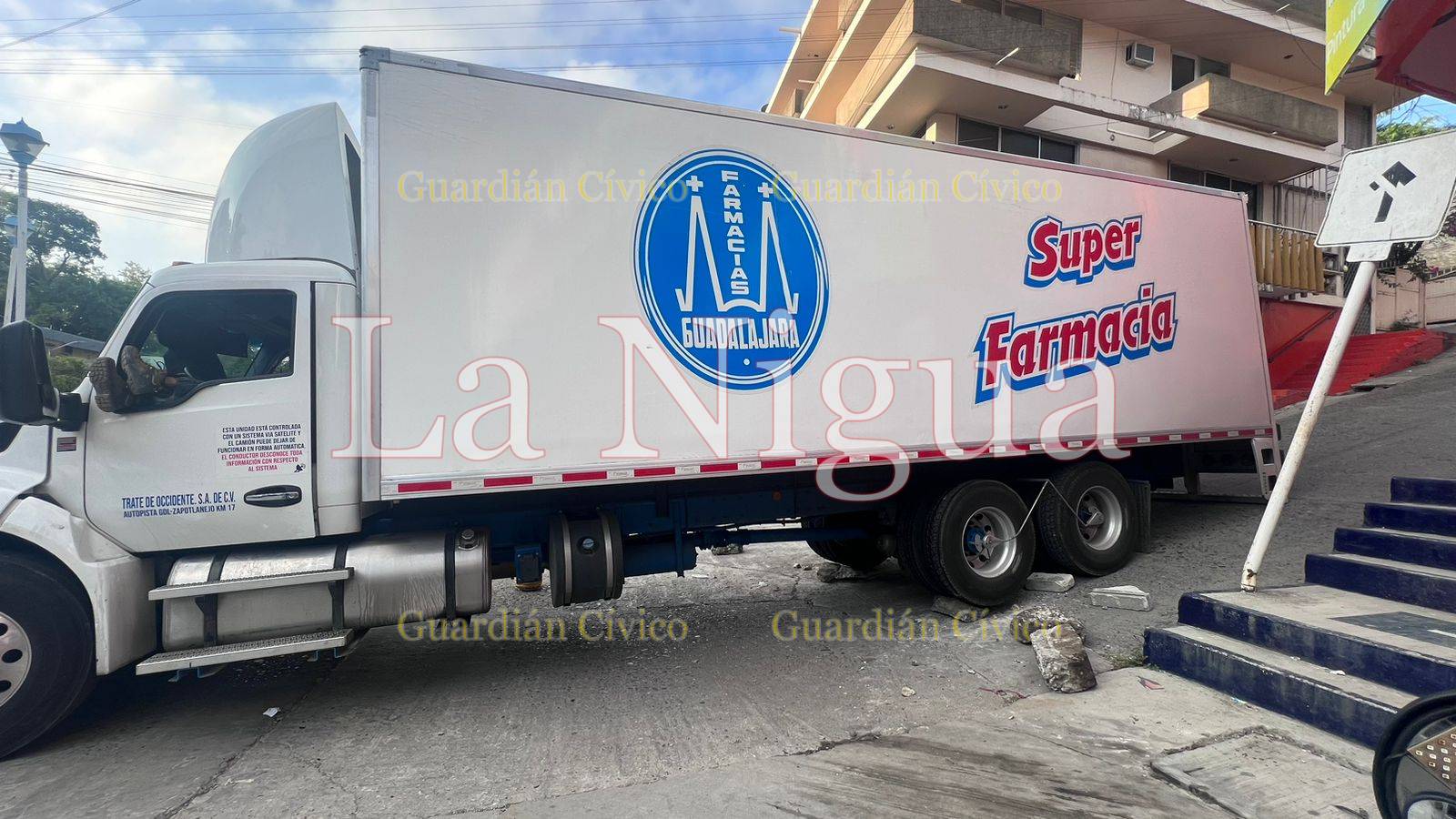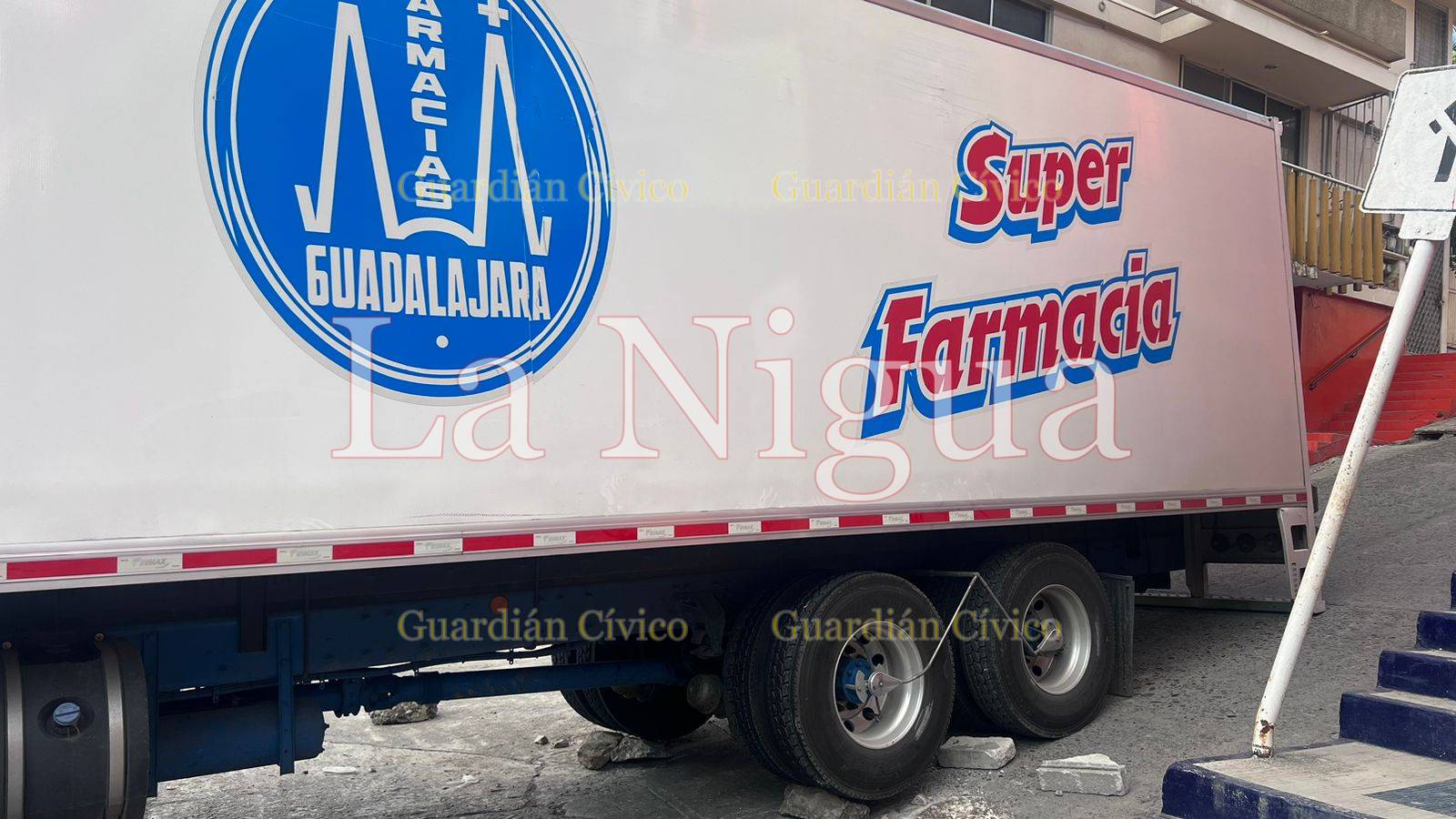 Con piedras y bases de concreto trataron de rescatar la pesada unidad propiedad de Farmacias Guadalajara, sin embargo, fue imposible.