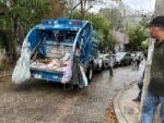 Se informó que el camión compactador derrapó por lo mojado del pavimento y provocó que terminara chocando contra dos vehículos estacionados.
