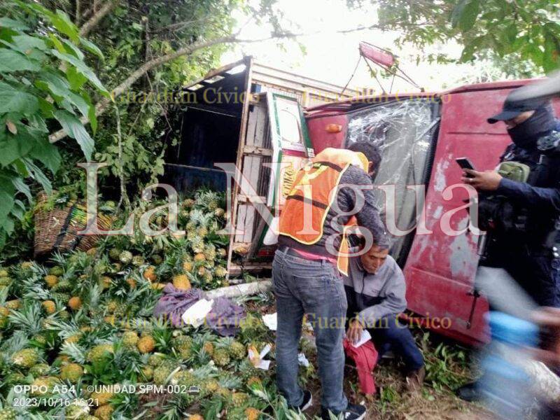 La tarde del lunes 16 de octubre, una persona de la tercera edad resultó con lesiones luego que el camión donde viajaba y que transportaba piñas se volcara en la carretera 145 a la altura del puente El Cuchillo.