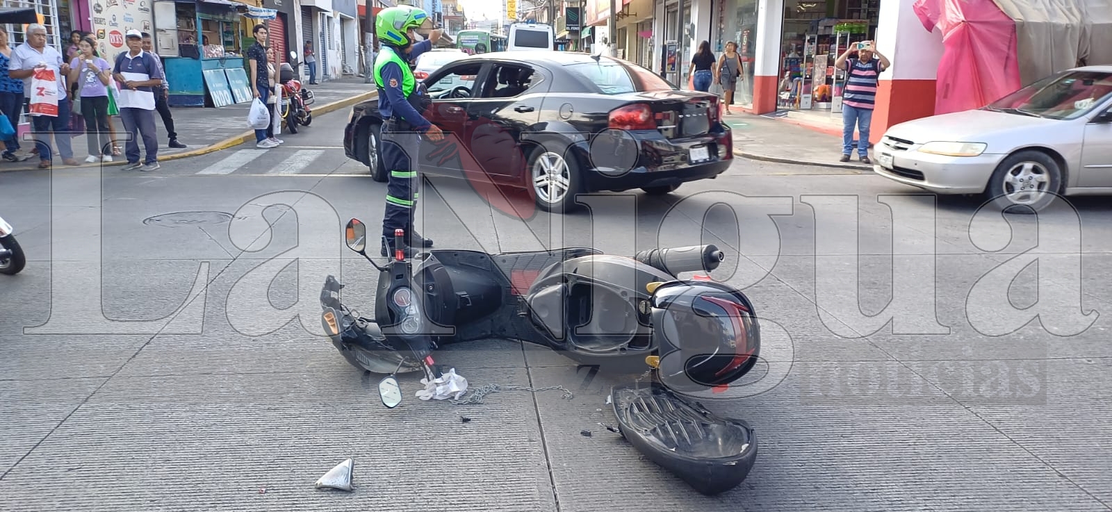 Córdoba, Ver.- Un joven que se desplazaba a bordo de una motoneta, terminó con algunos golpes debido a que fue impactado por una camioneta Toyota, debido a que su conductora al no respetar los señalamientos de vialidad ni tampoco realizar alto total, provocó el accidente en el cruce de la avenida 2 esquina de la calle 15 en la colonia Centro.